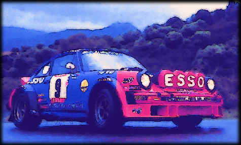 ポルシェもラリ−に出てました。テ−ルを派手に振ってコ−ナ−を曲がってた。 |